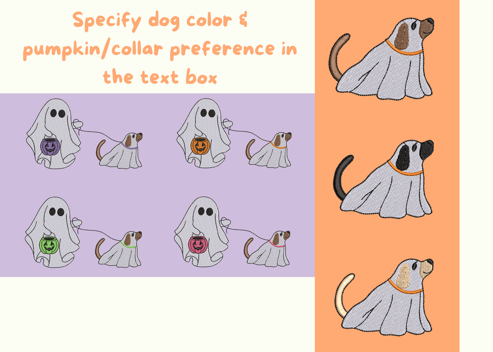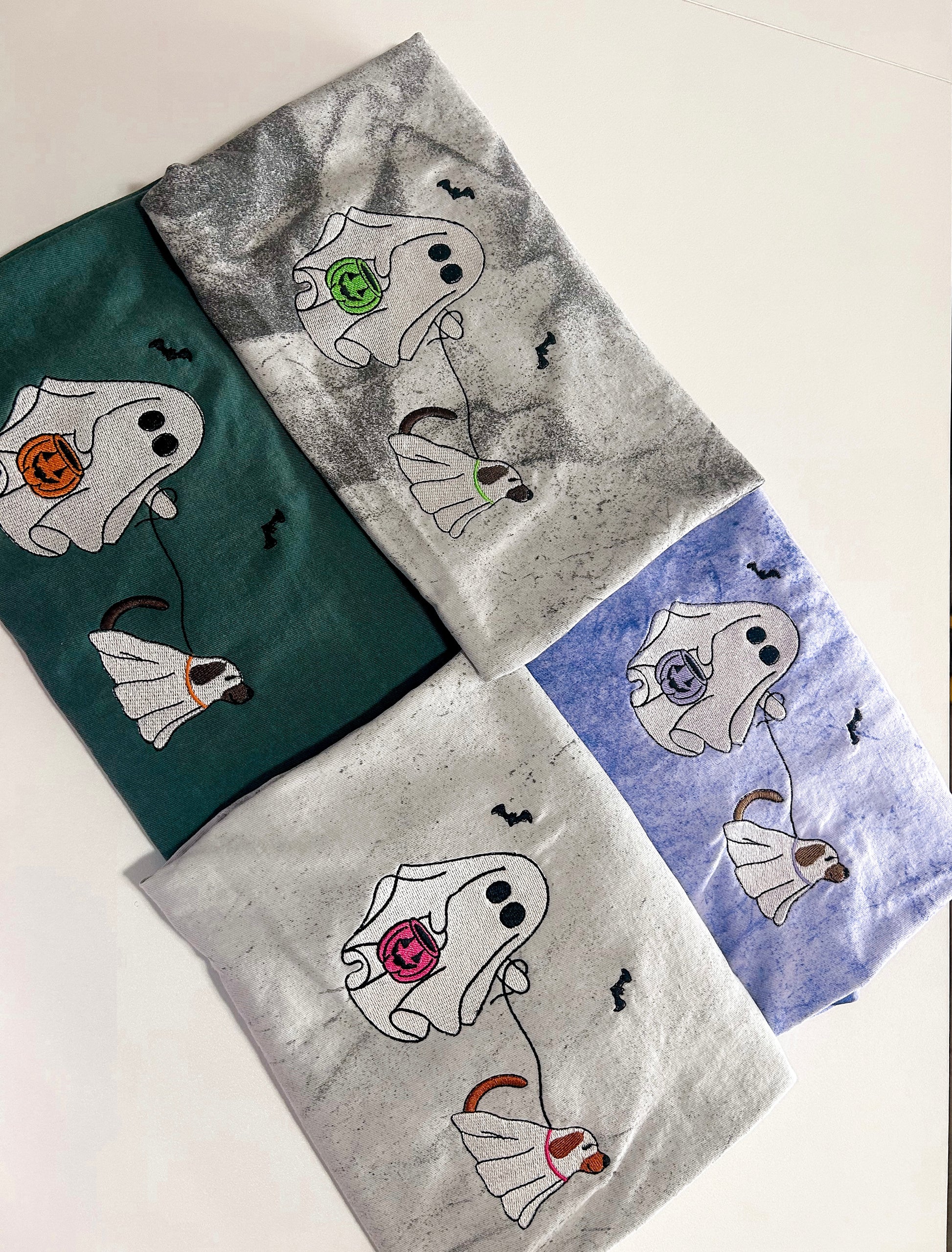 This embroidered design has a ghost walking their ghosty pup - and it's customizable! Choose your dog color as well as pumpkin bucket and collar accents.